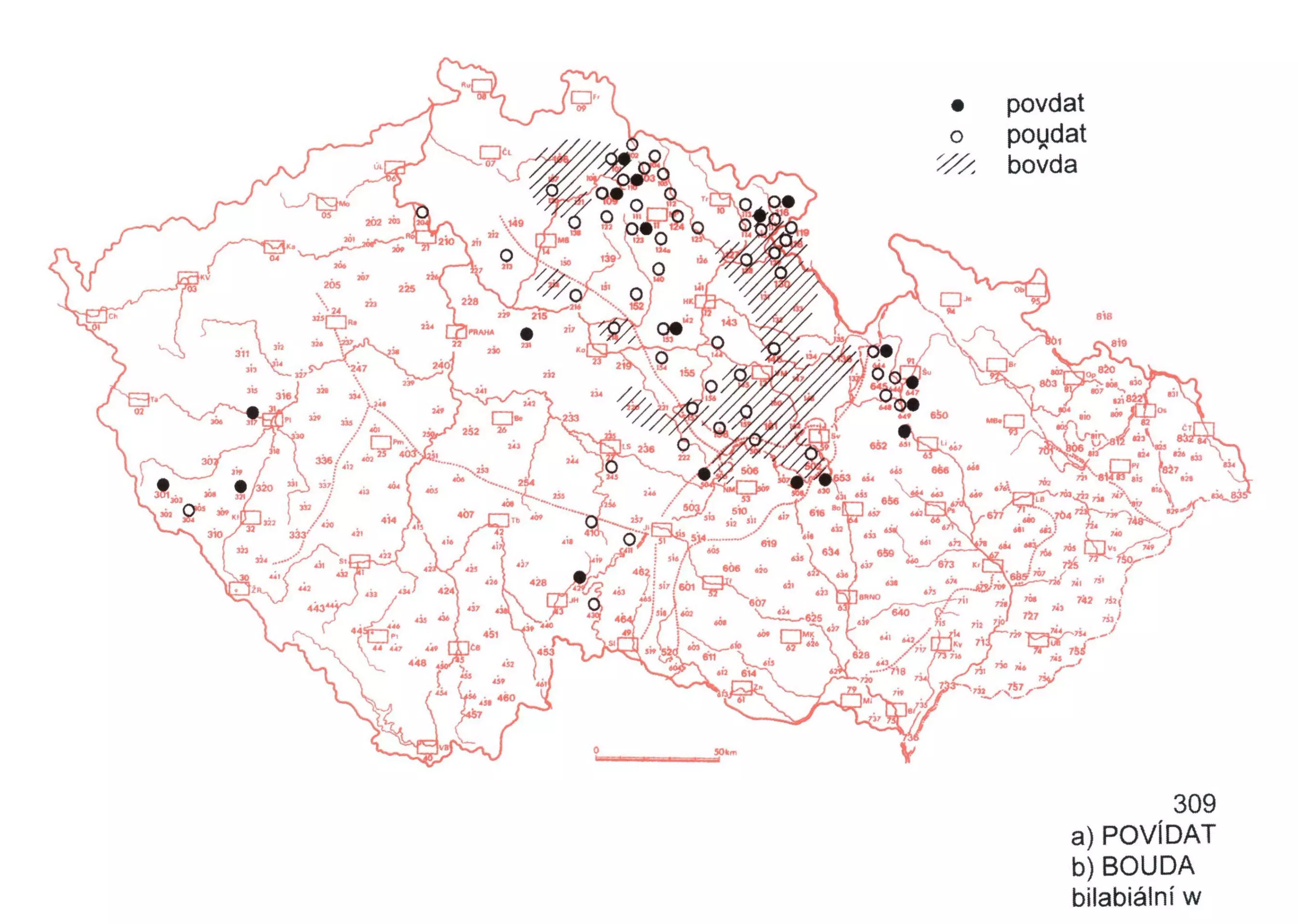 2 Na mapě jsou zakresleny případy nářeční výslovnosti typu povdat a bovda, včetně „mezistupně“ podat. Vznik hyperkorektní podoby bovda lze vysvětlit zvratnou analogií, u podoby povdat jde vlastně o v náležité, které je tu obnoveno (asi podle povědět).