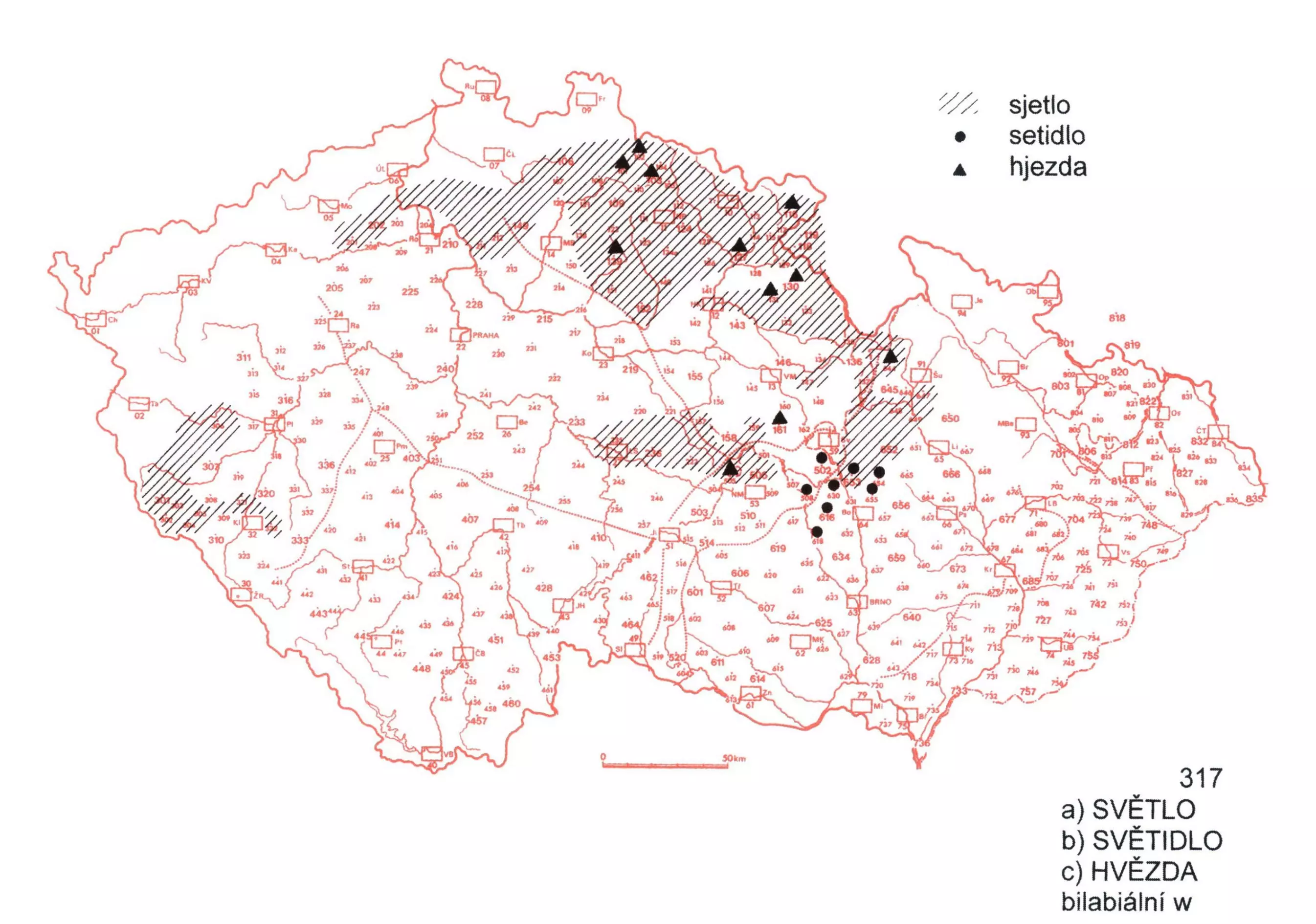 2 Na mapě pozitivně zakreslujeme územní rozložení nář. hláskových obměn sjetlo, setidlo a hjezda, u nichž došlo k zániku hlásky v ve skupení -vje-, u podoby setidlo navíc k následné ztrátě jotace (svjetidlo > sjetidlo > setidlo), srov. ČJA 1, 182 louč.