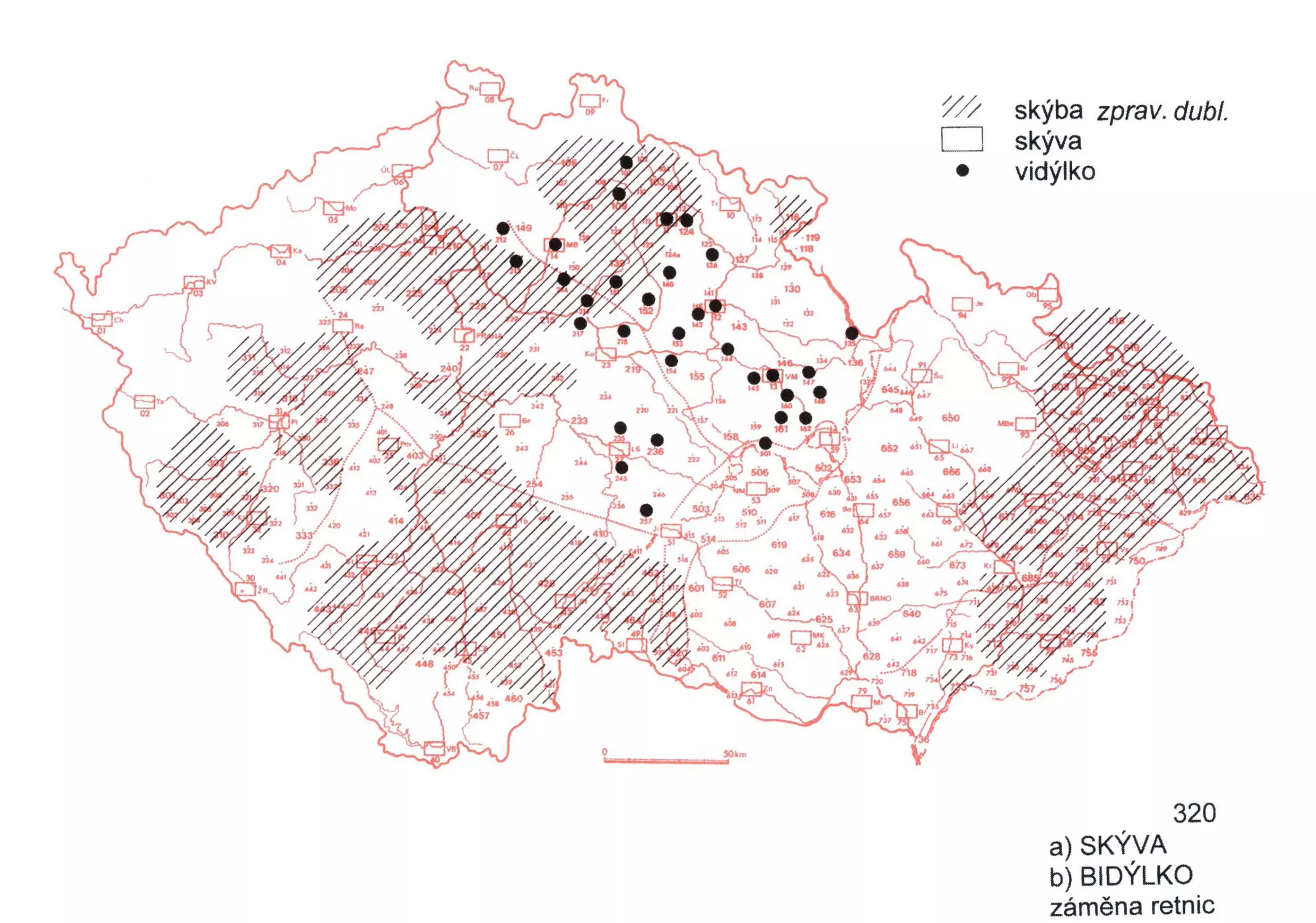 3 Hlásková varianta skýba se vyskytuje ve větší, západní části českých nářečí v užším smyslu, členité areály vytváří především v jižních Čechách a v záp. části nář. střč. a svč. Užívá se jí i ve Slezsku (včetně zkoumaných lokalit na území Polska), dále v celé sev. a střední části vm. nářečí a také na Holešovsku, Kroměřížsku a vých.