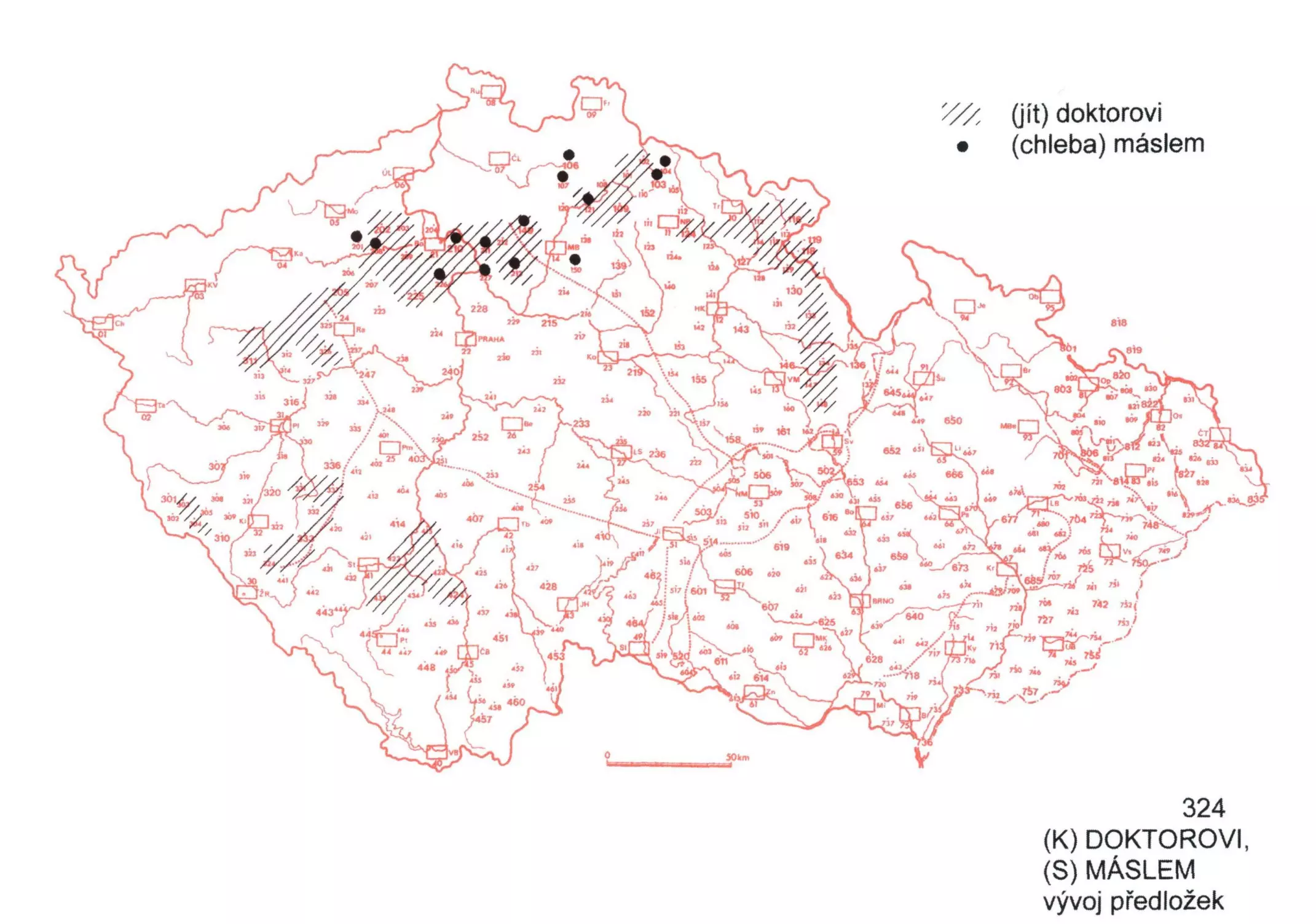 2 V porovnání se zánikem předložky v (srov. ČJA 5, 323) je zánik předložek k a s méně obvyklý. Při výzkumu byl sledován ve spojeních: k matce, k vodě, k holiči, k autu; s matkou, s vodou, s holí, s autem. Pro prezentaci na mapě jsme zvolili jako zástupná spojení jít doktorovi a chleba máslem, ta zahrnují i zapsané doklady další: jiť holičoj, pojedu holce, běžte babice, vrátil se domu mámě, dosloužila smrti; husa housatama, chodit holou hlavou, nepřijeli houskama, čekala vobjedem, stejně stará Vendou apod. Vzhledem ke skutečnosti, že substantiva po předložce začínají na různé hlásky, nelze předpokládat, že se jedná o změnu ryze hláskoslovnou; tento jev přesahuje do roviny syntaktické.
