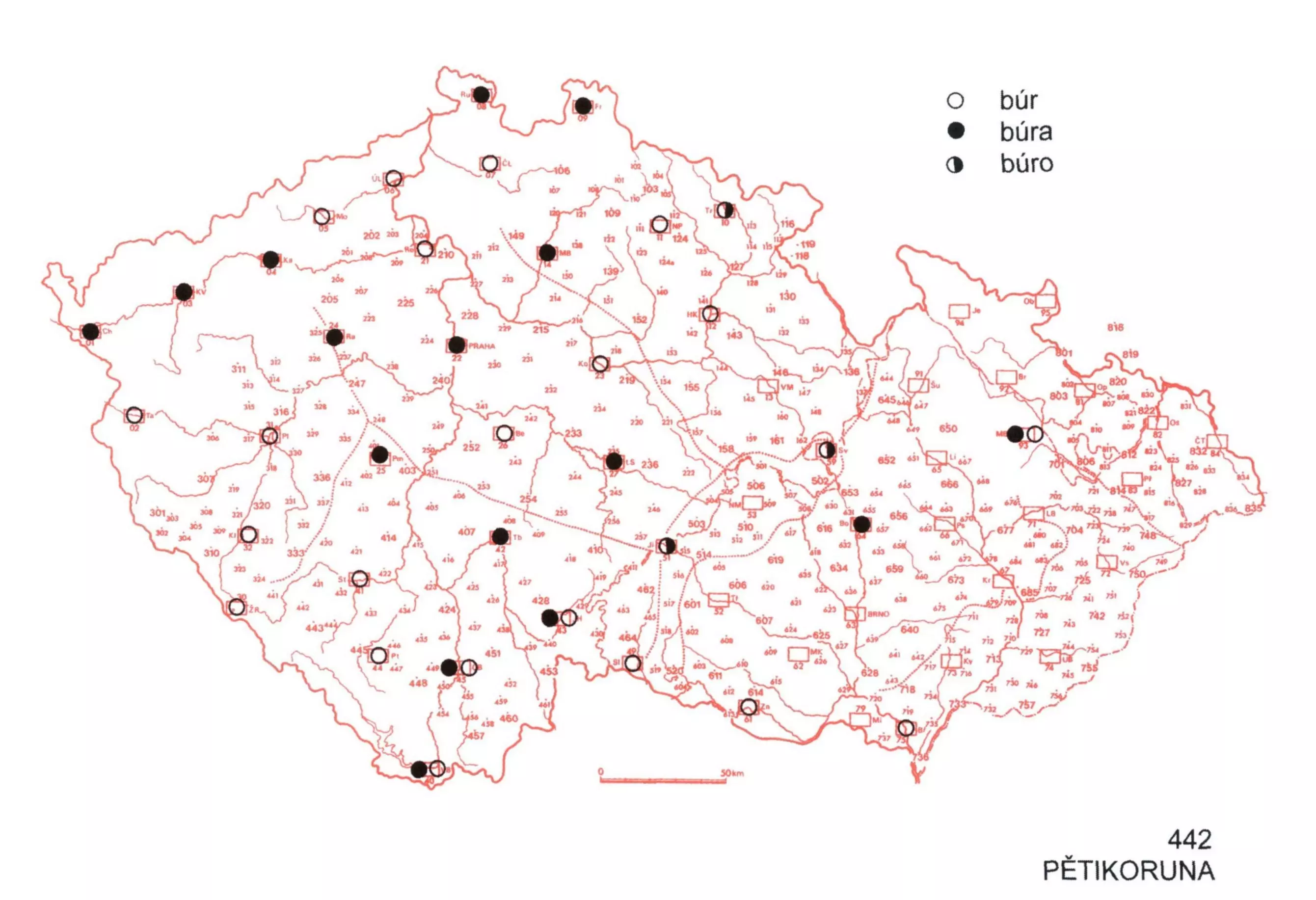 2 Mapa je zaměřena na slangové výrazy pro pětikorunu. Pozitivně zachycuje jen lexém búr (patrně původu argotického) a jeho morfologické obměny búra a búro.