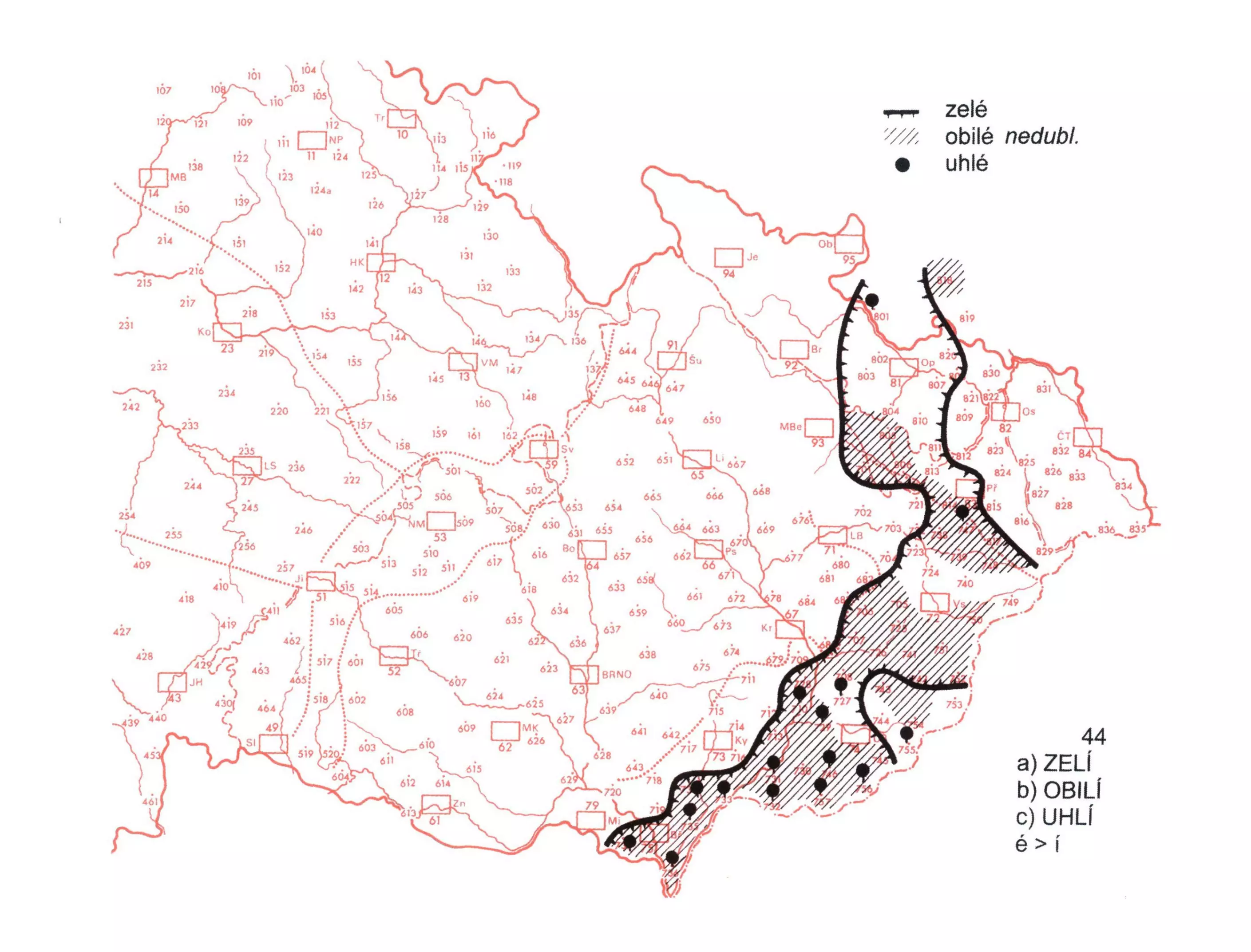 2 Na mapě je zakreslen zeměpisný rozsah pouze podob s nezúženým -é v koncovce: zelé (izoglosa), obilé (šrafa) a uhlé (značky).