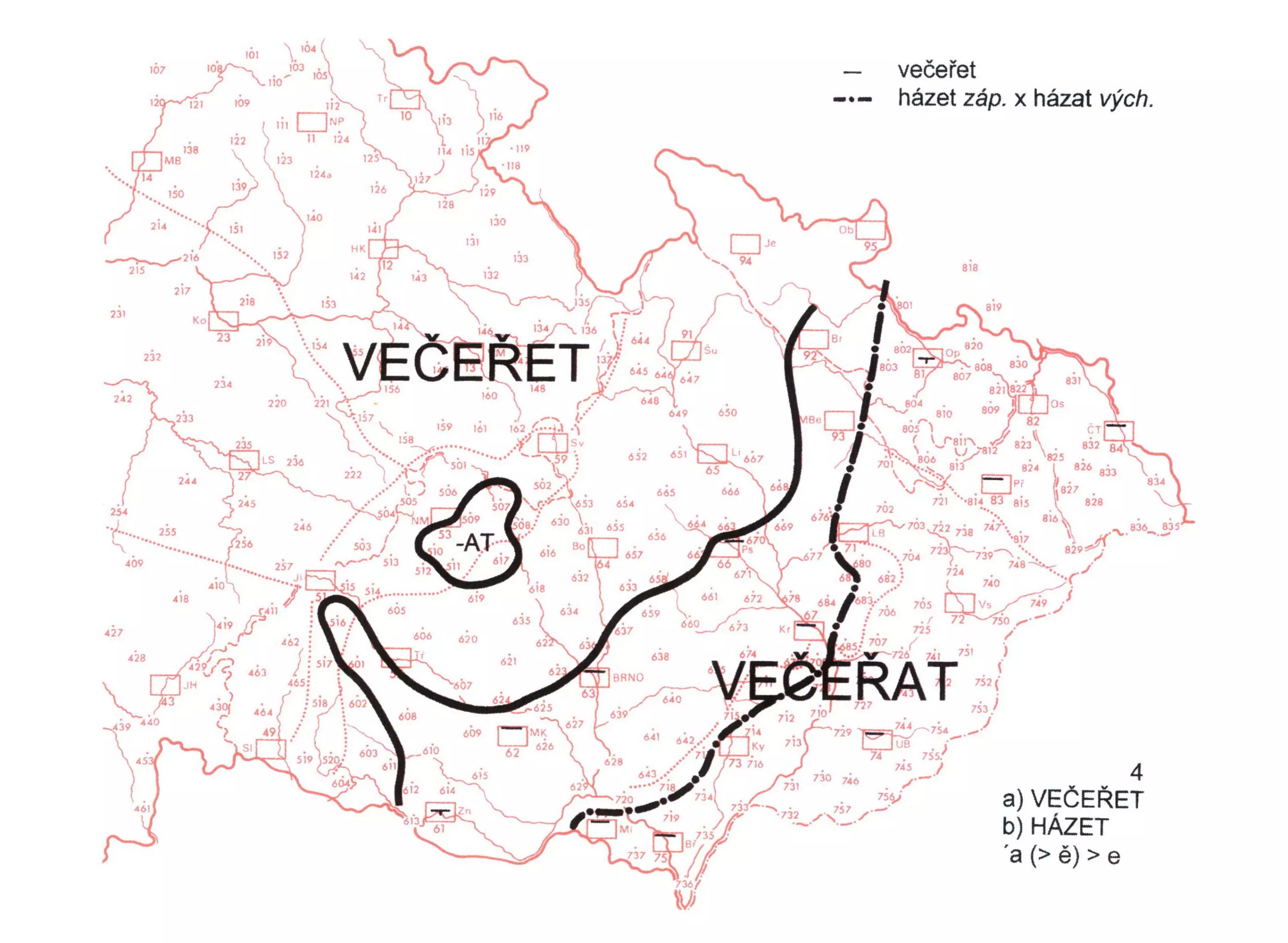 3 Přehlasovaná podoba večeřet, shodná se spis. jazykem, zabírá celé Čechy a sousední část Moravy po linii Znojmo–Třebíč–Brno–Prostějov–Bruntál. Nepřehlasovaná forma večeřat pokrývá území vých. od vymezené hranice a navíc malý areál na jv. Novoměstsku. Do měst na teritoriu podoby večeřat proniká varianta večeřet.