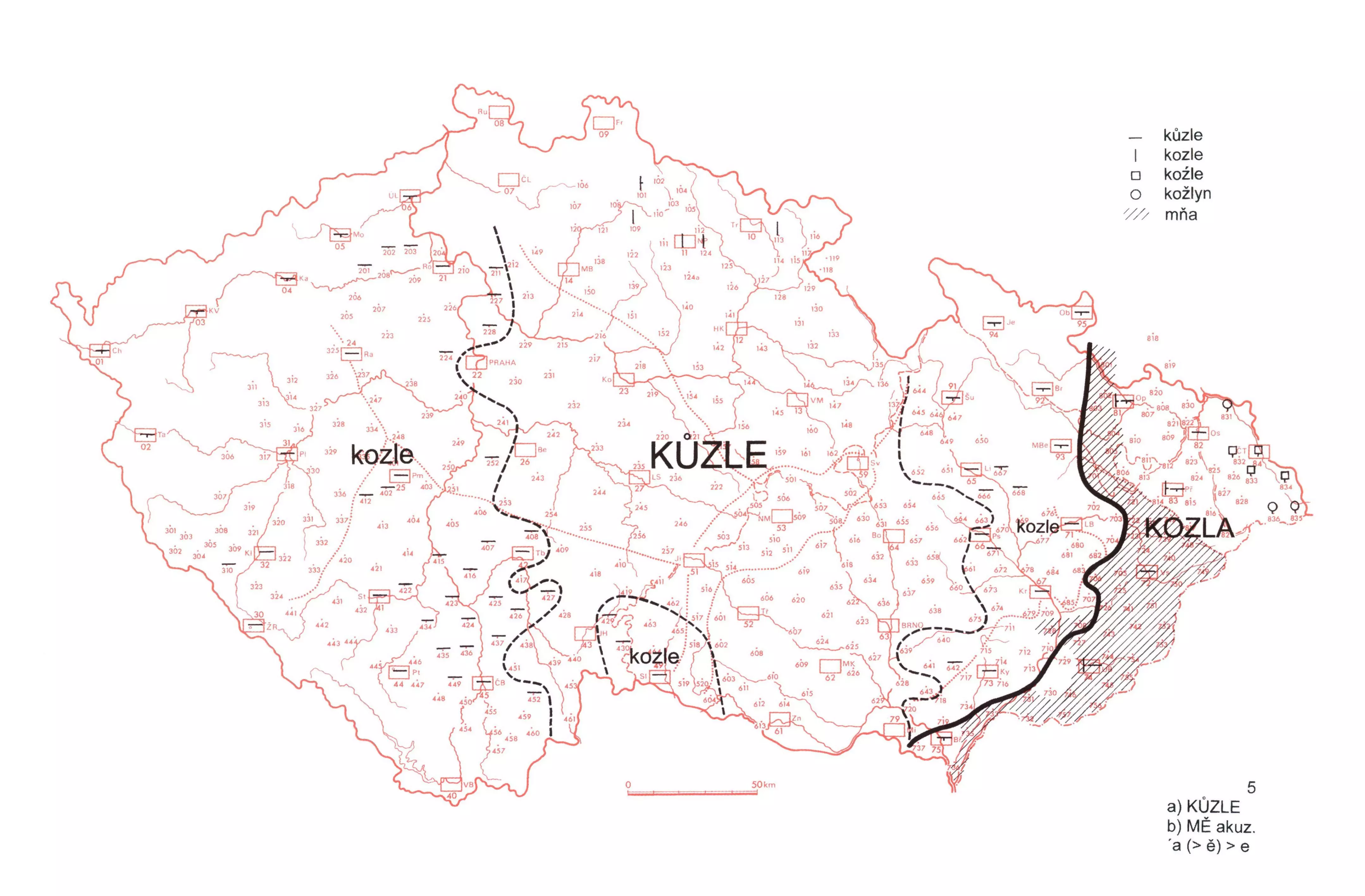 3 Nepřehlasovaná podoba kozla zabírá vm. nář. (kromě pruhu při jejich záp. hranici) a slez. nář. čes. typu. Forma kozle pokrývá vých. polovinu strm. nář. s přilehlým záp. úsekem vm. nář., odděleně se dokládá z areálu na rozhraní jv. Čech a jz. Moravy a dále zahrnuje celou záp. polovinu Čech.
