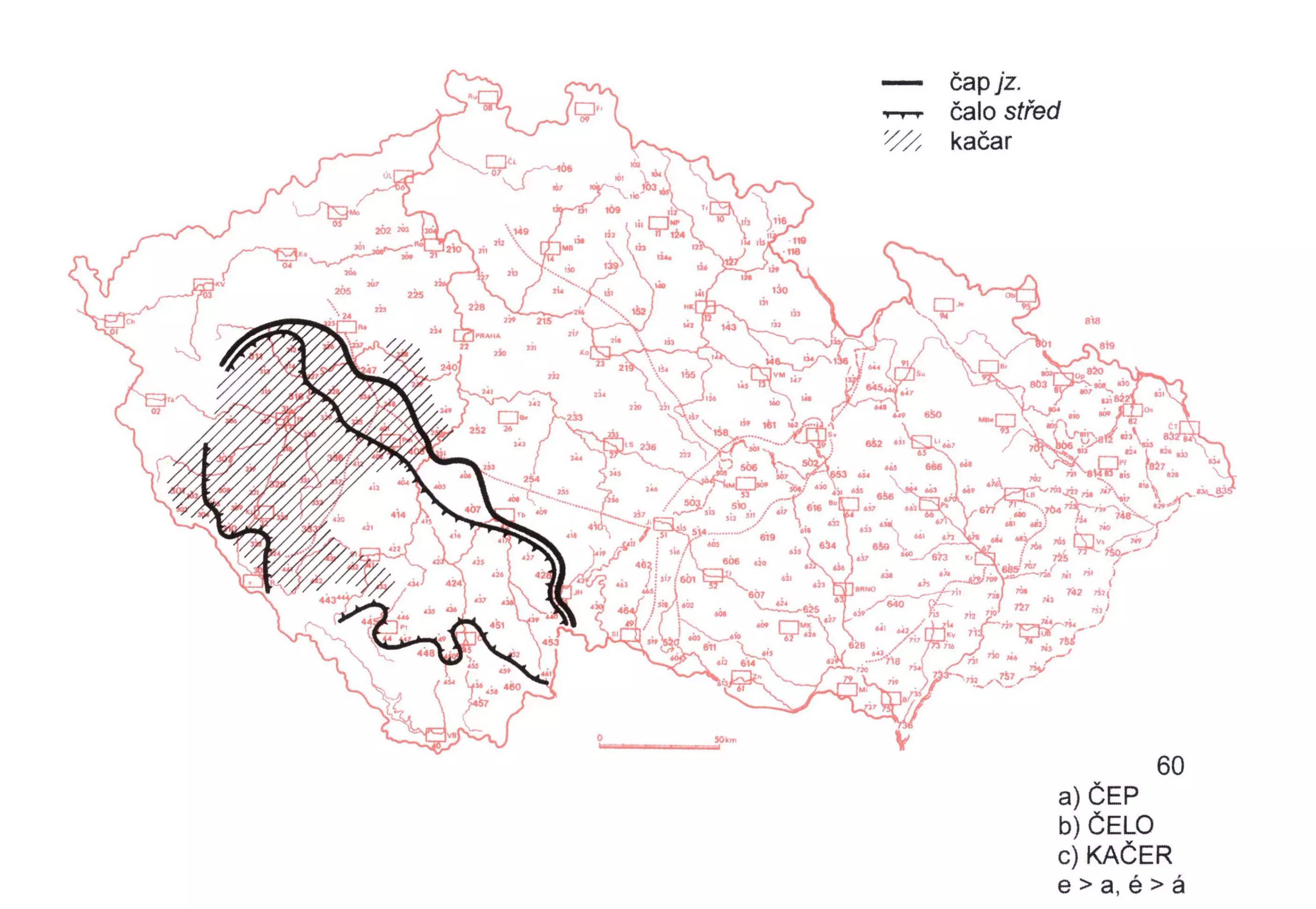 2 Po souhlásce č byla změna e > a sledována na slovech čap ,čep stavidla u rybníka‘, čalo a kačar.