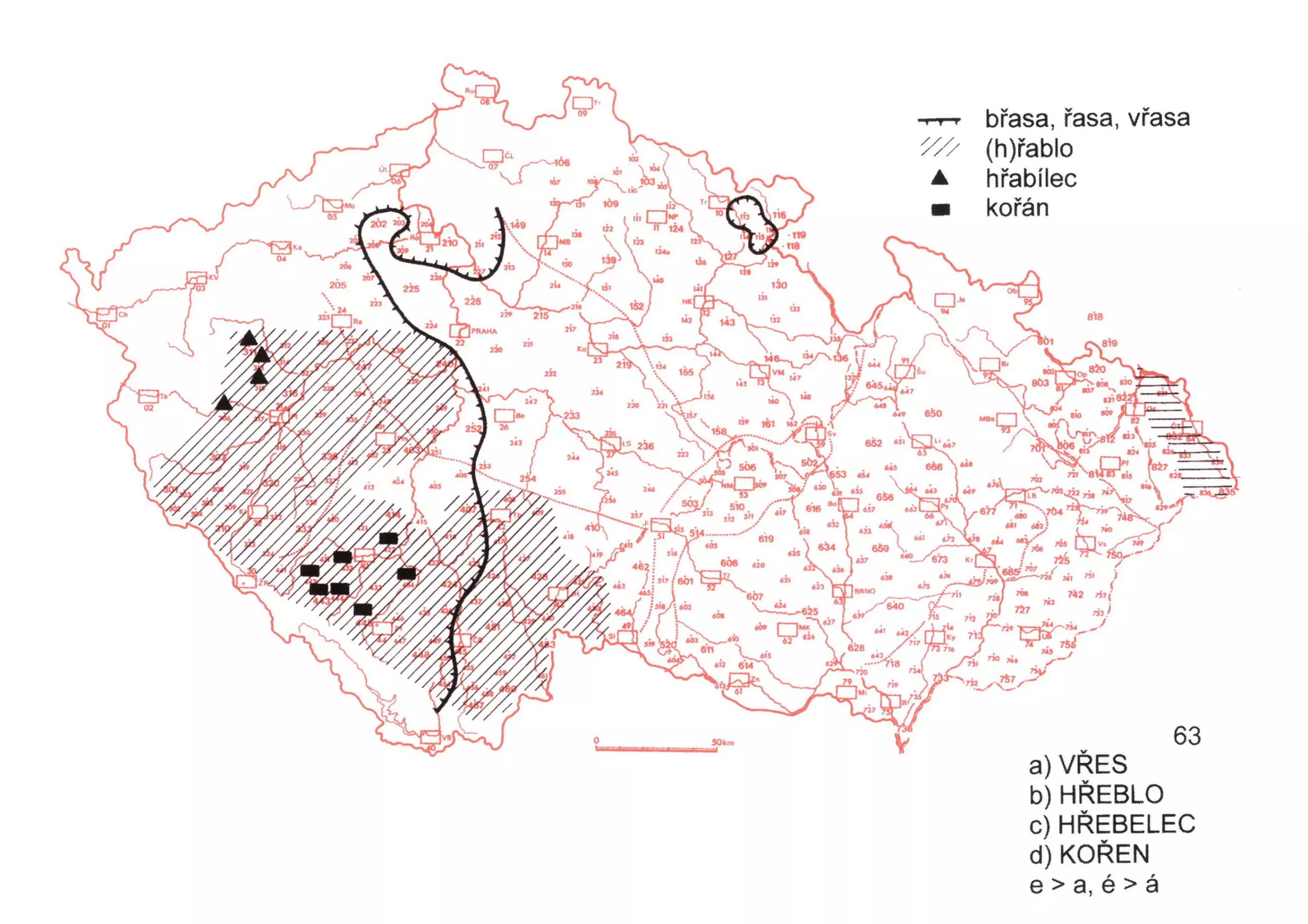 2 Na mapě je zachyceno zeměpisné rozšíření změny e > a po souhlásce ř.