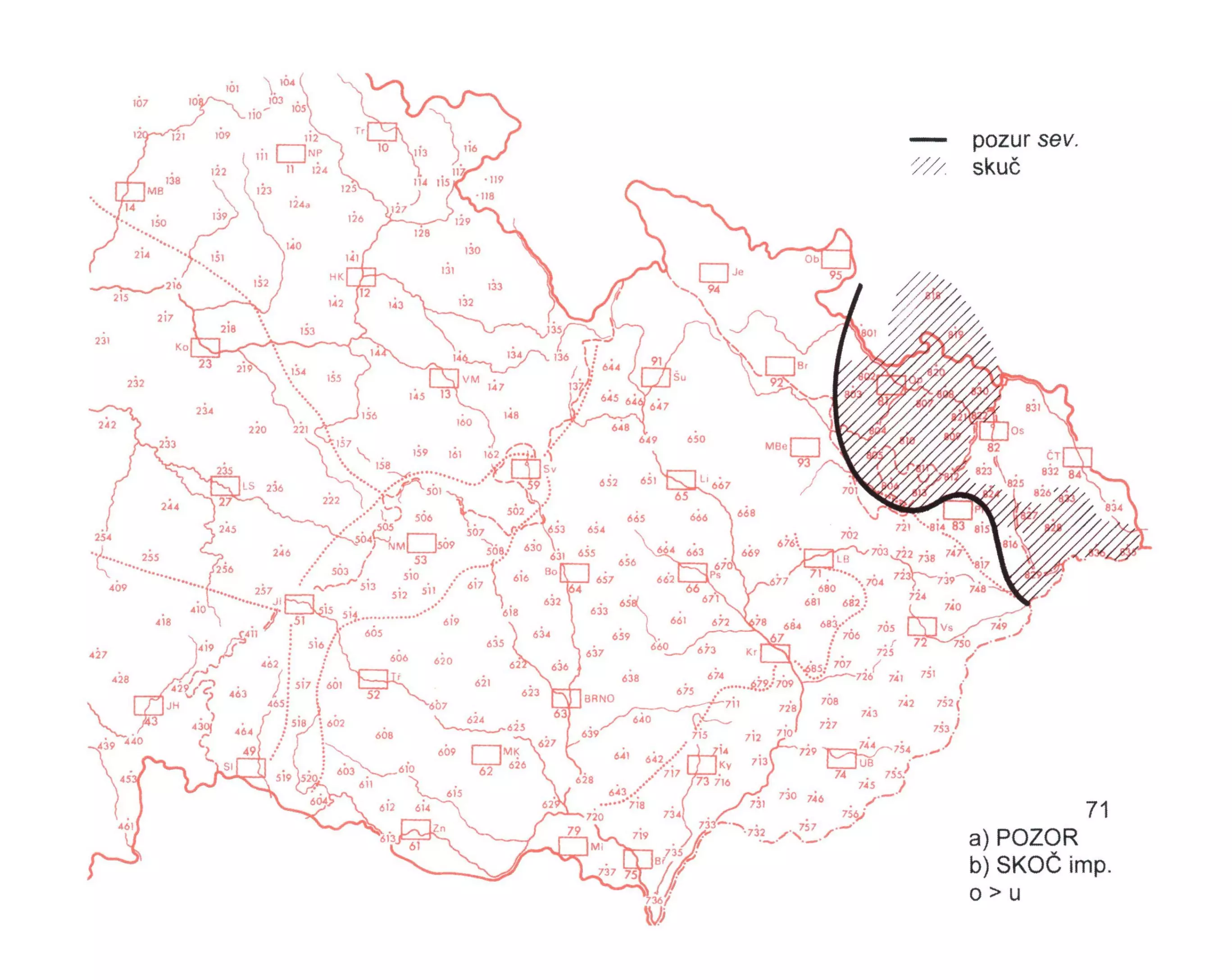 2 Mapa sleduje zeměpisné rozšíření hláskových obměn maskulina pozor a imperativního tvaru skoč ve slez. nářečích Byly zde zaznamenány hláskové varianty pozur a skuč, u nichž je hláska -u- reflexem sekundárně zdlouženého vokálu o (k zdloužení docházelo po ztrátě jeru, příp. po odpadnutí koncového vokálu, např. v imp. skoči > skoč zanikla jedna koncová slabika). Výslovnost tohoto ó byla na území slez. nář. zavřenější než na ostatním