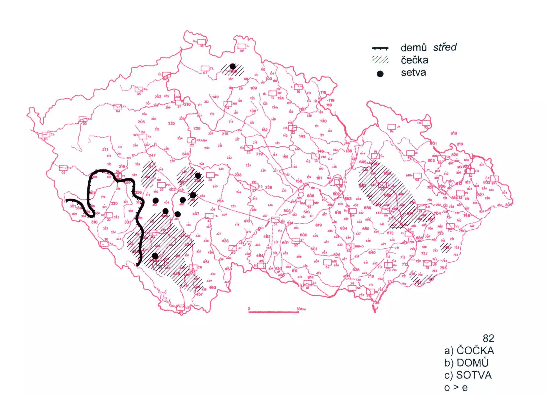 2 Mapa zachycuje územní rozložení tří slov, v nichž se vyskytuje -e- místo -o-.