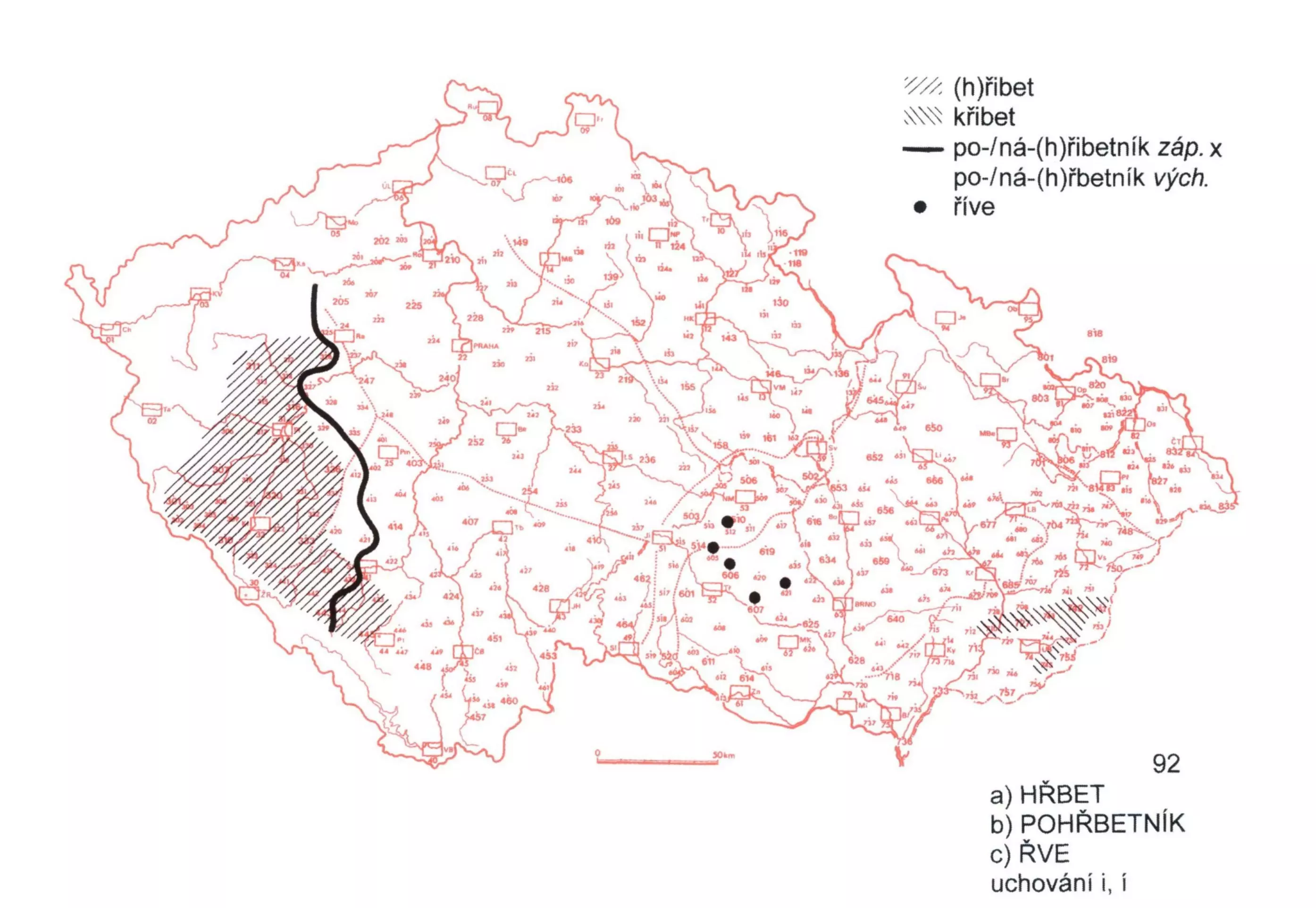 2 Mapa zachycuje pozitivně šrafou výrazy hřibet a křibet, oba ve významu ,záda‘. Podoba hřibet vznikla z formy *chribetъ, dublety k psl. *chrьbьtъ (> hřbet; tak ve spis. jazyce a ve většině dialektů). Počáteční h- vzniklo z ch- asimilací k znělému b, k- proniklo do varianty křibet záměnou zadopatrové souhlásky.