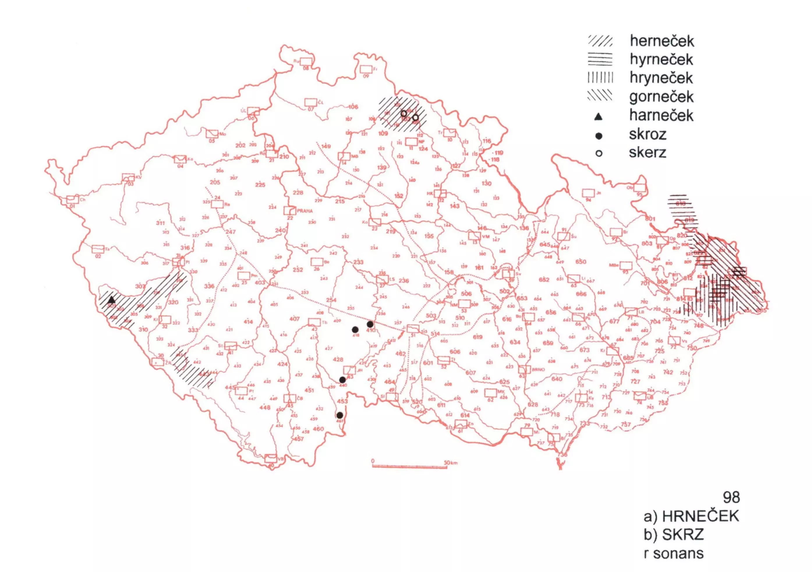3 Podoba herneček vytváří areál v Podkrkonoší, na Chodsku (zde též ojedinělá varianta harneček), na sz. Klatovsku a již. Plzeňsku. Forma hryneček přesahuje z Frenštátska na Frýdecko-Místecko, kde se střídá s obměnou hyrneček. Ta se dále dokládá z Ostravska a ze zkoumaných obcí v Polsku. Přechodová nářečí česko-polská pokrývá podoba gorneček.